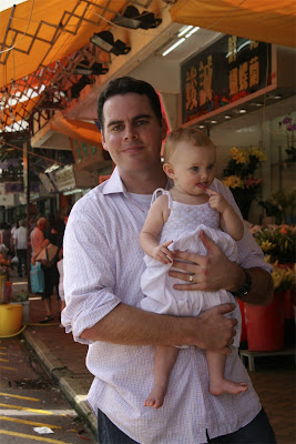 We sweated our way through both markets, occasionally popping into a store to steal some of their air conditioning. Ingrid has a new little clip on fan that keeps her cool, though it rarely spins because she is so busy sticking her fingers into the blades to stop the motion. The compulsion to purchase a bird came over us as we thought about how romantic it would be to live in HK and have a songbird in one of those elegant old wooded birdcages. Thankfully better judgement crept in as we realized we'd have a hard enough time keeping our orchid alive let alone a little songbird.